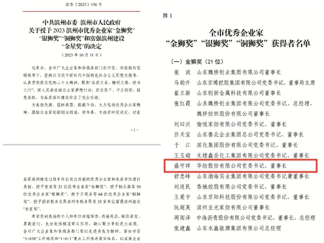 會(huì)上,對(duì)在品質(zhì)濱州建設(shè)過程中作出突出貢獻(xiàn)的優(yōu)秀企業(yè)家和先進(jìn)單位進(jìn)行了表彰頒獎(jiǎng),公司黨委書記、董事長盛守祥先生榮獲2023濱州市優(yōu)秀企業(yè)家“金獅獎(jiǎng)”。