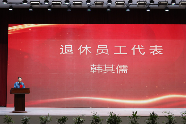 盛守祥為退休員工代表頒發榮譽證書,退休員工韓其儒代表80位退休同志做表態發言。