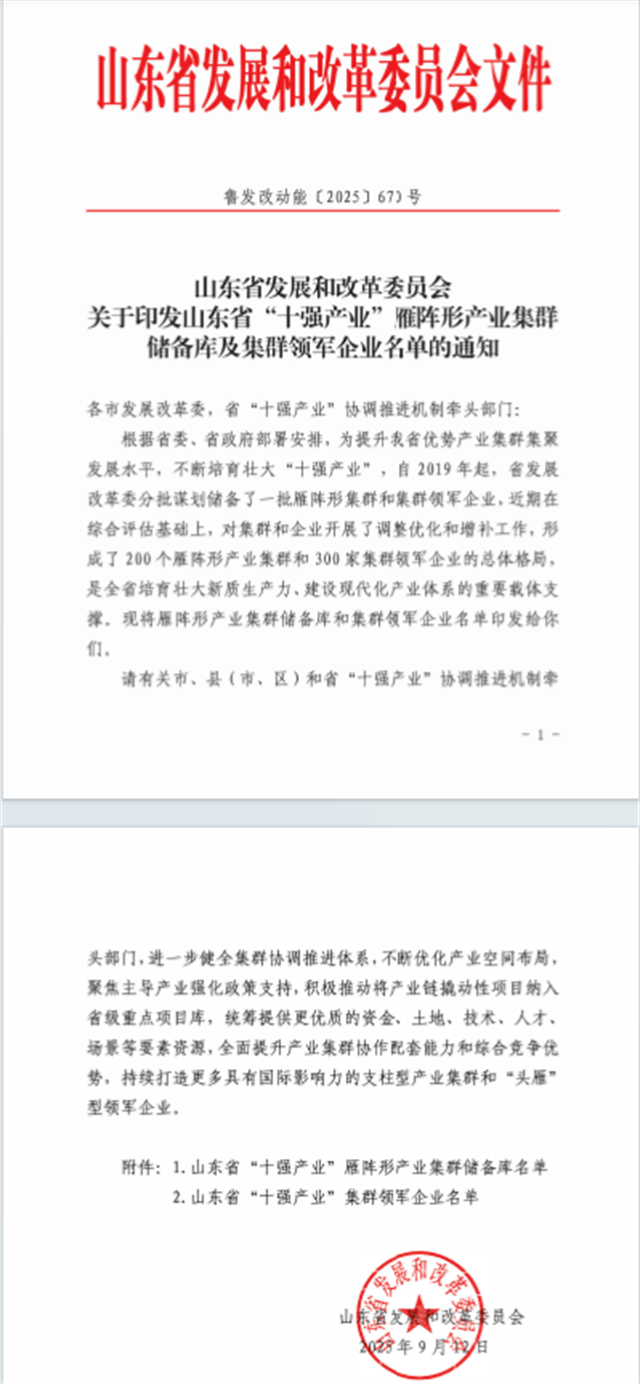 近日,省發展改革委組織開展了2025年度省“十強產業”雁陣形產業集群及集群領軍企業評選工作,經行業評價、專家評審、綜合論證等程序,研究確定了擬增補雁陣形產業集群28個,集群領軍企業27家。公司憑借在行業中的顯著優勢和綜合實力,成功入選山東省“十強產業”集群領軍企業。